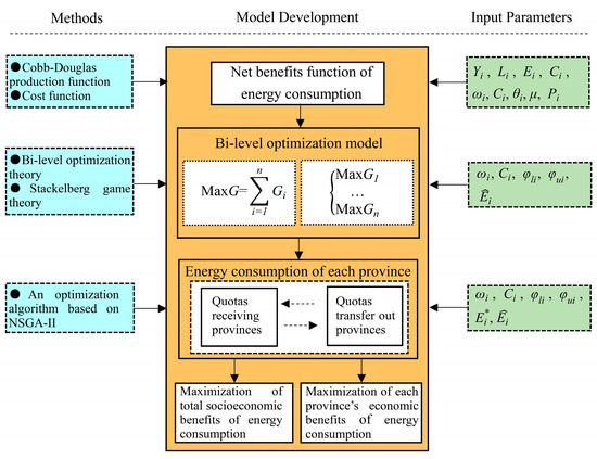 This study applies a transfer tax to improve China’s energy consumption management model. On the premise of ensuring the completion of the overall target, provinces that overfulfil the energy consumption control target transfer their remaining energy consumption quotas to other provinces that fail to meet the target while levying a transfer tax. The tax cost depends on the transferred energy consumption quotas and common transfer tax rate determined by the central government. The central government first develops the energy consumption transfer tax policy as a means of stimulating the energy-saving potential of provinces; then, each provincial government adopts its own strategy to achieve energy consumption control goals at the highest economic benefits of energy consumption. This process can be built as a bi-level decision-making optimization model based on the Stackelberg dynamic game theory with a leader–follower strategy. In a leader–follower game, the leader has a leadership advantage and can take the lead or a favorable position in the game, and the follower must take the game after the leader. In the ECTTM, the central government, as the leader of the game, determines an optimal tax rate to optimize the total socioeconomic benefits of energy consumption under the overall energy consumption control target, and each provincial government, as the follower of the game, attempts to obtain the optimal net benefits of energy consumption according to the observed tax rate. Essentially, this model is a bi-level optimization problem with a generalized Nash equilibrium, and an optimization algorithm based on NSGA-II is applied to determine the optimal solution. Figure 3 presents the model development flow chart, elucidating the ECTTM development’s main steps.