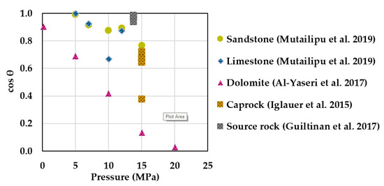 Numerous authors have described the wettability of scCO2–brine–rock systems [30,31,32,33,34,35,36,37,38,39,40,41,42,43,44,45,46,47,48,49,50,51,52,53,54,55,56,57,58,59,60,61,62,63,64,65,66,67,68,69,70,71,72,73,74]. During CGS, water-wettability over scCO2 is often preferred because it limits upward vertical migration and increases residual trapping in the reservoir [75,76,77], as well as increasing structural trapping, thus reducing the risk of scCO2 breakthrough in the confining zone [78,79]. Figure 1 shows a literature compilation of scCO2–brine–rock contact angles as a function of pressure for sandstone [66], limestone [66], dolomite [55], fine-grained caprocks [49], and source rock [58], measured at similar temperatures (~50 °C). A water-wet behavior with respect to scCO2 is observed for most rocks. An exception is dolomite, which has lower hydrophilicity and shows strong negative pressure dependence with cos θ [55]. Aside from pressure, other parameters such as temperature and salinity exhibit less clear influence on θ. Studies conducted on quartz show increasing θ with increasing temperatures [40,44,51,66]; sandstones exhibit no clear trend [62,66]; whereas calcite [56] and carbonate [32] show decreasing θ trends with increasing temperature. Regarding salinity, some papers report quartz and calcite surfaces becoming slightly less water-wet in high salinity [38,56,66]. However, studies conducted on real rocks show either no trend in θ with salinity for a silica/dolomite-rich shale caprock [54], or a slight decrease with salinity for sandstone [62]. Inconsistencies in θ values are mostly attributed to differences in surface cleaning methods [44,71], rock heterogeneity [31], and surface roughness [57,62].