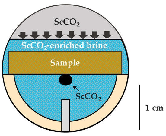 Several configurations have been used to measure the contact angle of scCO2–brine–rock systems in subsurface conditions [64]. The captive-bubble technique was chosen (Figure 2) in order to keep the brine sample saturated during the measurement and avoid possible drying out if surrounded by a scCO2 environment. The measurements were conducted using a drop shape analyzer (DSA100, Krüss GmbH, Hamburgh, Germany) coupled with an HPHT unit (Eurotechnica, Bargteheide, Germany) with a maximum working pressure and cell temperature of 69 MPa and 200 °C, respectively. Prior to the measurement, a brine-saturated sample was mounted on a custom-made, chemically inert holder (PEEK) that slides through a known outside diameter needle (~1.587 mm) that orients with the center of the sample. This orientation step allows the scCO2 bubble to contact the ion-milled surface of the sample, reducing the roughness impact on θ and minimizing lateral heterogeneity. Then, roughly 30 mL of brine was introduced into the system until it covered the top surface of the sample. The unit was heated slowly up to 65 °C. ScCO2 was injected from the top (gas cap), allowing diffusion into the brine and maintaining a constant pressure of 20.7 MPa, which was also monitored. After the fluid equilibration had taken place (~2 h), one scCO2 bubble was carefully extruded from the needle using a separate dosing unit. Image calibration was performed, and the software (ADVANCE, version 1.10.0) recorded the static scCO2–brine–rock contact angle over time. The exact same procedure was conducted on the samples after scCO2–brine–rock treatment.