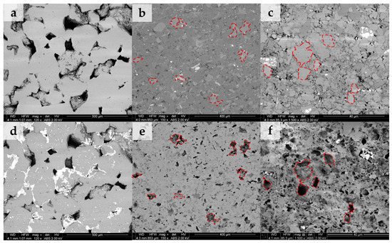 Backscattered images (BSEs) of the same sample area before and after scCO2-enriched brine treatment. (a–c) represent areas before treatment for samples S1, S2, and S3, respectively. Their same areas after treatment are sequentially shown in (d–f). Sample S1 indicates no geochemical reactivity aside from salt precipitation. Sample S2 shows preferential dissolution of carbonates (highlighted in red), while the silicate/aluminosilicate framework remains preserved. Sample S3 reveals intense surface alteration by dissolution of carbonates, which was expected given their larger initial carbonate content. Other potentially reactive minerals such as clays and pyrite were little affected during the process.