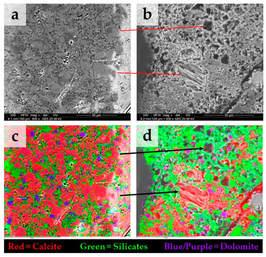 Figure 4 shows BSE images on a strongly reacting area of the sample S3 before (Figure 4a) and after (Figure 4b) treatment. In Figure 4c, the spatial elemental mapping before treatment obtained with EDS shows predominantly calcite with minor amounts of silicate and dolomite. Figure 4d shows that, after treatment, calcite is the only carbonate mineral dissolved, whereas dolomite remains unaltered. XRF measurements performed before and after treatment at the surface of sample S3 indicate a reduction in the relative content of calcium oxide (CaO) from 55 wt.% to 14 wt.%, respectively.