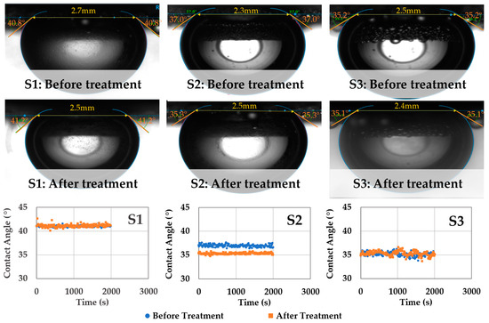 Figure 5 shows the summary of the captive-scCO2 bubble–brine–rock contact angle measurements conducted at the same experimental conditions (20.7 MPa, 65 °C) before and after scCO2-enriched-brine treatment. Before treatment, contact angles of 42 ± 1°, 37 ± 1°, and 35 ± 2° are observed for samples S1, S2, and S3, respectively. These contact angle values are comparable to ones reported in the literature for sandstones, caprock, and source rocks at similar experimental conditions (Figure 1) [49,55,58,66]. It can be observed that these rocks maintain their water-wettability even at larger pressures up to ~20 MPa. After scCO2-enriched brine treatment, negligible changes in contact angles are observed, despite the surface reactivity (primarily S3) shown in Figure 3. Trapping of surface bubbles can also be noted on sample S3, which develops during the fluid-equilibration phase and indicates that in-situ reactions could be taking place as the brine becomes saturated in scCO2.