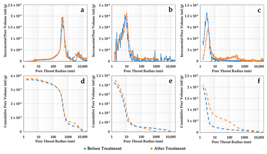 Pore throat size distributions (PTSDs) obtained with MICP before and after scCO2-enriched brine treatment. The incremental curves for samples S1, S2, and S3 are shown in (a–c), respectively. Their cumulative curves are sequentially represented in (d–f). Little alteration is observed in the PTSD of the samples, aside from a small increase in amplitude in the 100–1000 nm range for sample S3 followed by a drop in the 1–10 nm range.