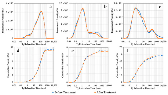 NMR porosities as function of T2 relaxation time before and after scCO2-enriched brine treatment. The incremental curves for samples S1, S2, and S3 are shown in (a–c), respectively. Their cumulative curves are sequentially represented in (d–f). Negligible alteration in the NMR porosity distributions is observed, aside from a small inflection around 1–20 ms for sample S3, which does not affect its cumulative porosity.