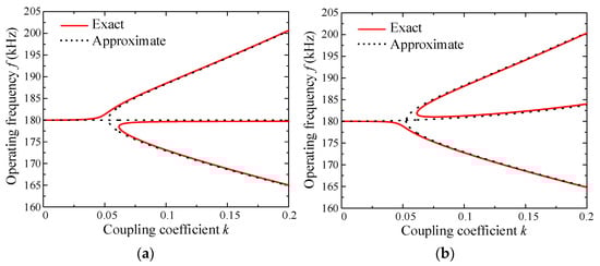 Comparison between the exact and approximate solutions for the operating frequencies. (a) SP topology. (b) PS topology.