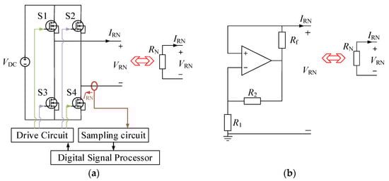 The schematic diagram of the negative resistance. (a) With the negative resistance constructed by a full-bridge inverter. (b) With the negative resistance constructed by an op amp.