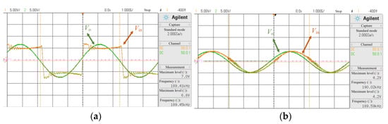 To evaluate the transfer properties of the four basic NR based MR-WPT topologies, the output-input voltage ratios are measured in the experiment. For SS and SP topologies, the input voltage waveform is a square wave, as shown in Figure 5a. Hence, the input fundamental voltage Vin_f of SS and SP topologies can be acquired by fundamental wave analysis method. Therefore, the output-input voltage ratio of SS and SP topologies can be calculated by Vo/Vin_f. For PS and PP topologies, the input and output voltage waveform are sinusoidal, as shown in Figure 5b, so the input voltage Vin and output voltage Vo can be measured with an oscilloscope. Then, the output-input voltage ratio of PS and PP topologies can be calculated by Vo/Vin.