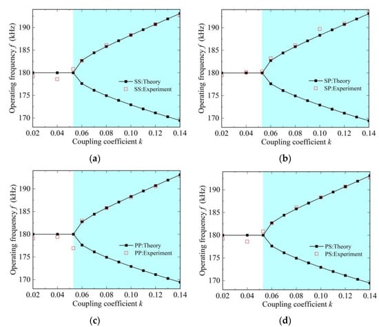 From the above analysis, the operating frequency of SS, SP, PP and PS topologies can be described as shown in Figure 6. It can be seen that the coupling region of the NR-based MC-WPT system can be divided into two parts: the strongly coupled region (k ≥ kC) and the weakly coupled region (k < kC). In the strongly coupled region, the bifurcation of steady solutions of the operating frequency occurs, the operating frequency of the four topologies has two real solutions ω+ and ω−, which are related to the compensation topology of the receiver. When the coupling coefficient decreases, the two real solutions ω+ and ω− coincide at the critical coupling coefficient kC. In addition, the maximum and average errors between the experimental and theoretical values of the four topologies are calculated. The maximum errors of the SS, SP, PP and PS topologies are −0.64%, −0.73%, 1.70% and 0.78%, and the mean errors are −0.17%, −0.17%, 0.34% and 0.18%, respectively. Therefore, the experimental results have a good agreement with the theoretical analytical results.