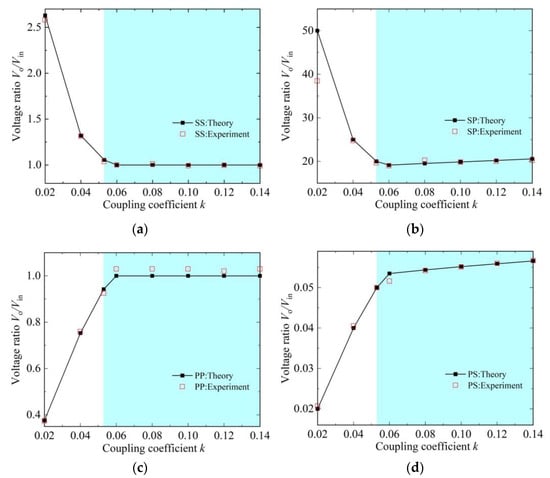 Voltage ratio as a function of the coupling strength k for the NR-based MC-WPT systems with SS, SP, PP and PS topologies. (a) SS topology. (b) SP topology. (c) PP topology. (d) PS topology.