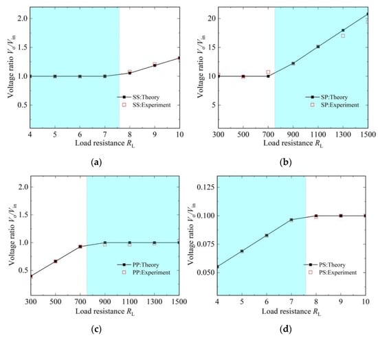 Voltage ratio as a function of the load resistance RL under k = 0.1 for the NR-based MC-WPT systems with SS, SP, PP and PS topologies. (a) SS topology. (b) SP topology. (c) PP topology. (d) PS topology.