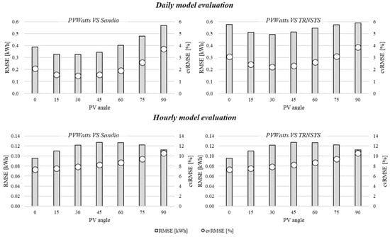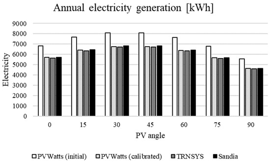 - The PVWatts model achieved higher electricity generation than the TRNSYS and Sandia models. Their deviations were constant, so efficiency reductions (e.g., 83.5%) were applied to validate the PVWatts model with the tracking feature.