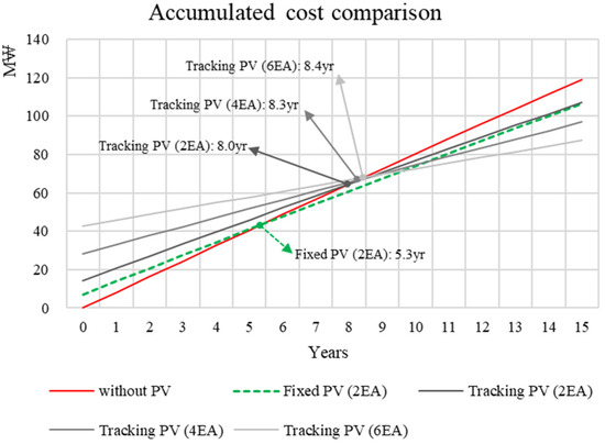 - The LCC analysis via the NPV method yielded a payback period of between 5.3 and 8.4 years for the tracking and fixed PV system. The total cost-saving percentage in the 15-year window compared to the case without PV was 18.7–26.8%.
