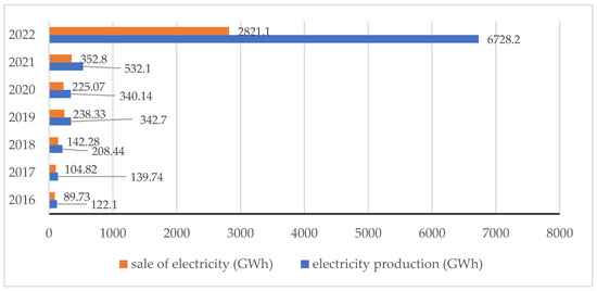 Renewable energy sources are an alternative to fossil fuels, and can contribute to the reduction in emissions of greenhouse gases [56,114,115]. It is expected that 40% of the energy consumed in the European Union will originate from renewable sources by the year 2030 [116,117,118]. Over the analyzed time period (2016–2020), a systematic growth in the generation of electric power from small RES power plants was observed, going from 122.1 GWh in 2016 to 342.7 GWh in 2019, alongside an increase in the amount of electricity sold which has been produced using RES to the obligated seller, going from 89.73 GWh in 2016 to 238.33 GWh in 2019. However, in 2020 both the generation and sale of such electric power slightly declined relative to the previous year (Figure 1).