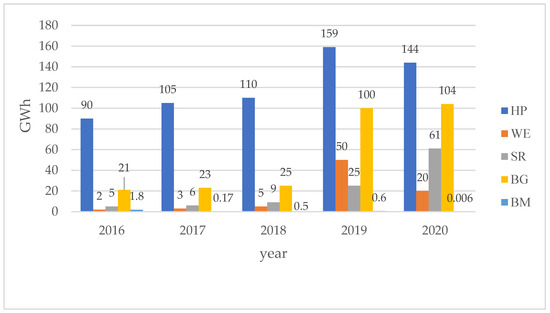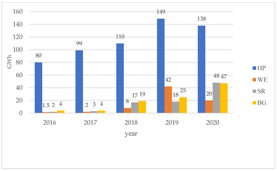 Production of energy in small RES installations in 2016–2020, including the division into types of sources (GWh), HP—hydropower, WE—wind energy, SR—solar radiation, BG—biogas (non-agricultural), BM—biomass (not visible on the graph). Source: the authors, based on [109].