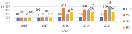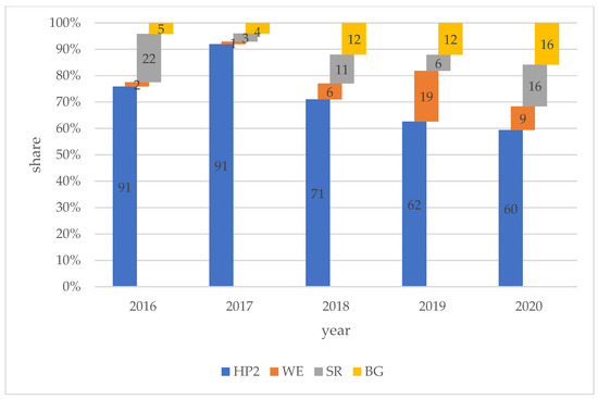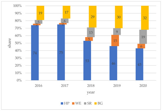 Sale of energy in small RES installations in 2016–2020, including the division into types of sources (GWh), HP—hydropower, WE—wind energy, SR—solar radiation, BG—biogas (non-agricultural), BM—biomass. (Biomass, due to its share of approximately 0.002%, was not included.) Source: the authors, based on [109].