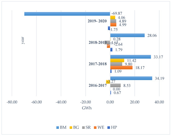 Absolute growth (difference) in sold electricity generated in small RES power plants from 2016 to 2020 by source type, presented year-to-year (in GWh). Source: the authors, based on [109].
