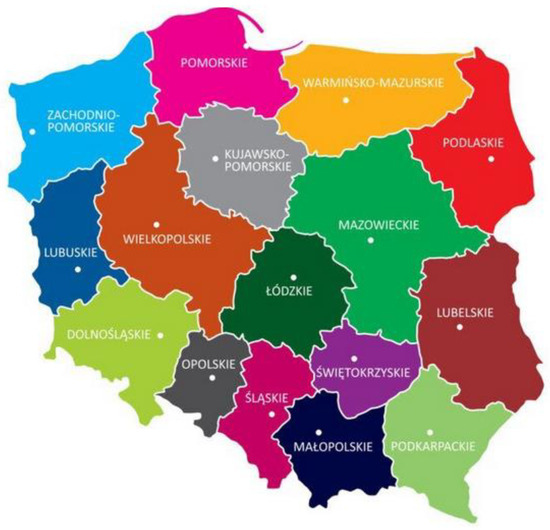 Since 2016, the Energy Regulatory Office in Poland [12], which is responsible for regulating the electric power market in Poland, has been issuing aggregated reports including data about the generation of electricity from RES, namely, by small renewable energy power plants. As mentioned, until 30 October 2021, small RES power plants had been defined as those with a total electric power capacity of over 50 kW but below 500 kW. Afterwards, the definition was modified, expanding the range of small power plants as the maximum power installed was increased to no more than 1 MW. Consequently, it would be unreliable to compare the data on small installations from the 2021 report with the data from previous years (2016–2020). Thus, our analysis comprised the data from 2016 to 2020. Different examples of power producers are given in Table 1. It should be underlined that one producer can have the same type of a small RES power plant in one province in different localities, the same type of small RES power plants in several provinces, or different types of small RES power plants in different provinces. The analysis of data from every province focused on the number of particular types of small RES installations and not on energy producers (Table 2).