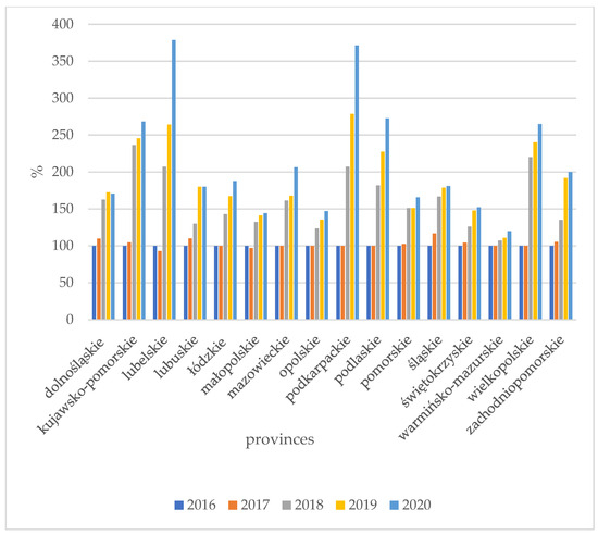 If there were any decreases, they were rare and very small, with just 1 installation fewer (between 2019 and 2020 in Dolnośląskie province and between 2016 and 2017 in Lubelskie and Małopolskie provinces). Throughout the whole period, the average number of installations in all the provinces continued to rise, going from 29 in 2016 to 56 in 2020. The lowest number of small RES power plants in 2016–2020 operated in Lubuskie province; the highest number was in Warmińsko-mazurskie province in 2016, Dolnośląskie province in 2017–2019 and in łódzkie province in 2020. With respect to Polish provinces (Figure 10), an increase in the number of small RES installations was determined in each of the 16 Polish provinces in each consecutive year and compared to the 2016 base year (Figure 11). What is important, however, is how the growth in numbers has evolved in each province. The largest increase in years was recorded in Lubelskie and Podkarpackie, while the smallest increase was in Warmińsko-Mazurskie.