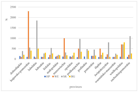 Between the beginning of the analyzed period (year 2016 = 100%) and its end (year 2020), there were significant changes in the Polish provinces regarding the number of particular types of small RES power plants (Figure 12). There was an increase in every source of small renewable energy plant in nearly all provinces. The following were the exceptions: