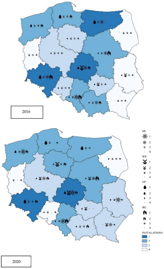 Figure 13 shows maps of Poland illustrating the status of small RES installations in the provinces at the beginning of the analyzed period, i.e., in year 2016, and at its end, i.e., in year 2020.