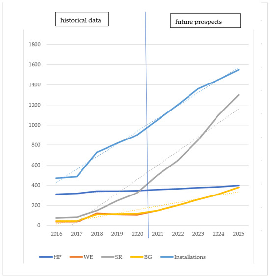 The objective of this study was to evaluate changes in the number of small renewable energy power plants and their power production volume in the years 2016–2020 with an outlook to the year 2025. It needs to be added that due to changes in the law, this outlook pertains only to power plants with a capacity up to 50 kW.
