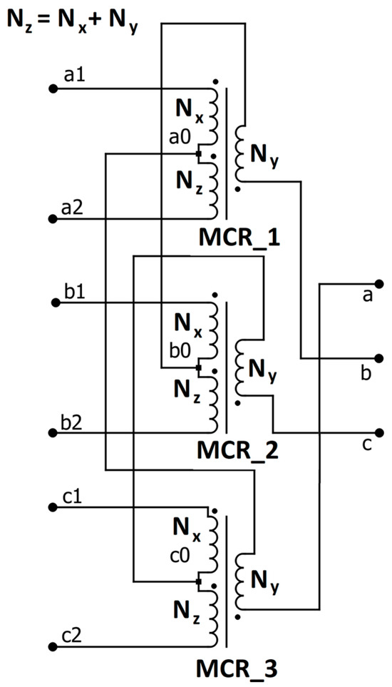 Winding configuration for the coupled reactor system in the TDSλ system, where MCR1,2,3 are magnetically coupled reactors numbered 1, 2, 3, respectively; Nx, Ny, Nz—numbers of turns for reactors in the TDSλ system; a1, a2, b1, b2, c1, c2 are inputs of TDSλ; a0, b0, c0 are connections between reactors; a, b, c are outputs of TDSλ.