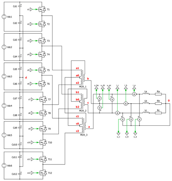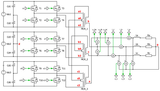 In the first variant, three single-phase inverters in an H-bridge system were connected to the TDSλ system (Figure 1). Figure 2 shows the topology of the concentrator with three of this type of inverter.