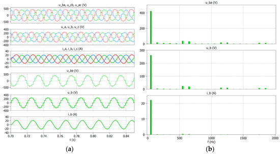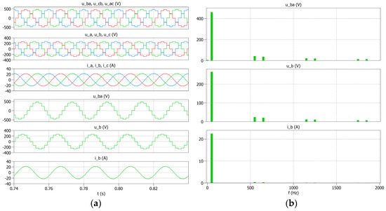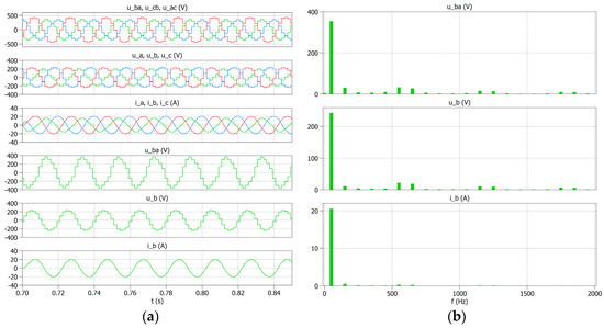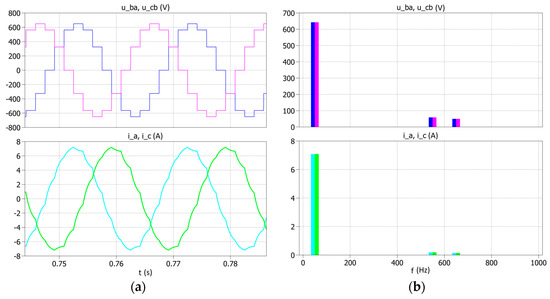 To compare the obtained experimental results with the simulation tests, a simulation was performed for the system in Figure 9 and the same power supply and load values were assumed. The examples of phase-to-phase voltage and current waveforms are shown in Figure 17a, and their spectra are shown in Figure 17b.