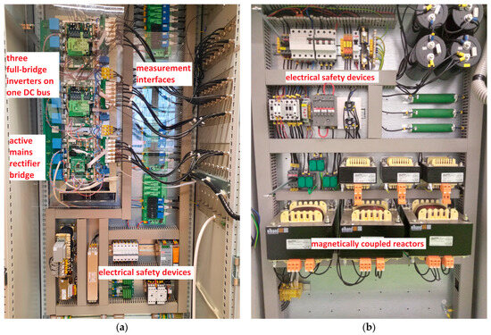 A test stand was adapted for the experiment, using a six-phase inverter on a single DC bus and magnetically coupled reactors in a TDSλ arrangement. The six branches of the inverter made it possible to create three single-phase full-bridge inverters. A photograph of the inverters and magnetically coupled reactors is shown in Figure 10.