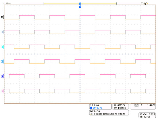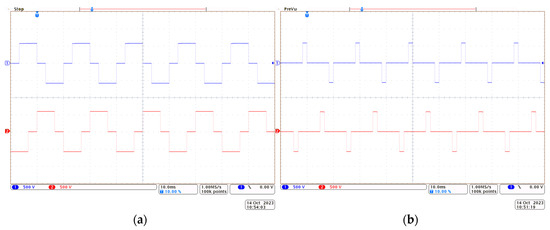 The following oscillograms (Figure 12a,b) show the control signals with the recorded dead time, which is necessary when implementing the adopted control strategy in the laboratory system. For the purposes of the test, the dead time was set to 2 µs.