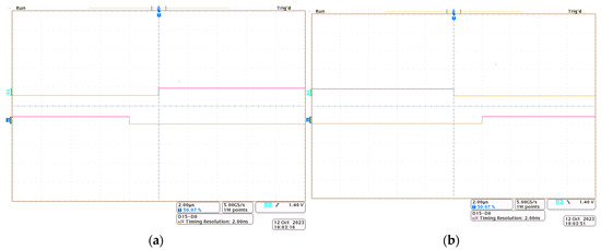 The oscillograms show the dead time for the electronic key control signals for electronic keys T1 and T2 (Figure 9), where: (a) T1-off/on, T2-on/off; (b) T1-on/off and T2-off/on.