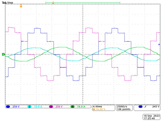 The oscillogram shown in Figure 14 shows the waveforms of output voltages and currents for two phases.