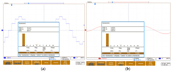 The following oscillograms show the voltage waveforms at the input of the magnetically coupled reactors at points a1-b1 (Figure 13a) and a1-a2 (Figure 13b). These are similar to those obtained in the simulation studies.