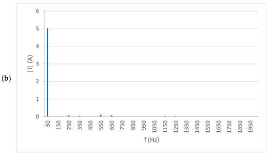 Figure 15a,b show an oscillogram with the voltage and current spectra of one of the phases for the 10th harmonic. As can be seen from this figure, the fundamental harmonic is dominant.