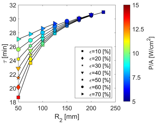 Simulations included variation studies in terms of void fraction (ε) and inner radius (R2). Effects of different specific surfaces (aV) are only marginally present for this operating mode and are, therefore, not presented. For each geometry configuration, the transient heating processes were performed with the maximum heating power of 100 kW specified in Table 1. The simulations were terminated as soon as the heating power dropped below 95 kW due to the implemented heating power control, when the permitted maximum heating temperature (TPtH,max) was exceeded. Results on charging durations (τ) are shown in Figure 2.