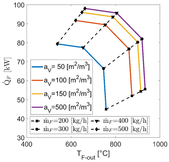 Steady-state thermal powers () and fluid outlet temperatures (TF-out) as a function of mass flow rate () and specific surface (aV) of the annular honeycomb body.