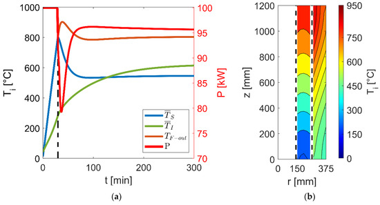 Transient heating processes in the first operating mode; (a): averaged inventory temperatures ()—(b): temporal characteristics of heating powers (P).