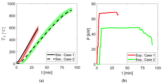 Exemplary results on two measurements for the first operating mode, the storage of electric heat within the electrically heated component, are shown in Figure 7. In the first case (red curve), a maximum total heating power of 66 kW was specified at an averaged inventory temperature () of 600 °C to be reached, and in the second case (green curve), a maximum total heating power of 47 kW at an averaged inventory temperature of 900 °C. The total heating power was divided area-proportionally between the inner (1/3) and outer (2/3) heating registers, and these values were used as input variables in the simulation model. The maximum permitted heating temperatures (TPtH,max) were specified as 1000 °C.