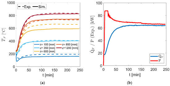 With respect to Figure 8b, at the beginning, the maximum specified heating power of 90 kW was achieved, which was reduced to 66 kW in steady-state condition. The reason for this was the implemented power control, which—after ending transient processes—led to a reduction of the heating power in order to maintain the permitted maximum heating temperature. The thermal power itself showed temporally increasing values due to initial thermal inertias, whereby at steady-state condition, 64 kWth was reached, resulting in only marginal heat losses of less than 3% related to the electric power. Analogously, variation studies were performed on steady-state heating powers and mass flow rates, showing comparable characteristics and good agreements between the transient experimental and simulation results.