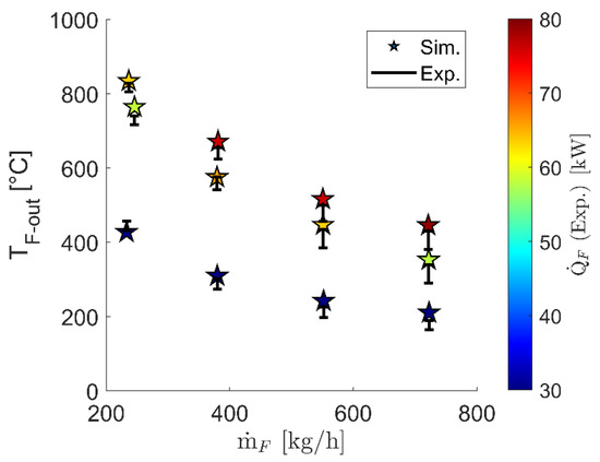 Steady-state fluid outlet temperatures (TF-out) and thermal powers () as a function of mass flow rates ().