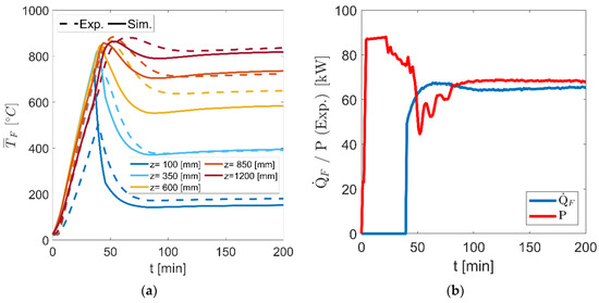 The results in Figure 7a show good agreement between the experimental and simulated temperature characteristics during the transient heating process for both measurements. Despite the radial heating input, comparatively homogeneous temperatures of the honeycomb body were achieved due to the high SiC thermal conductivity. Figure 7b also clearly shows the drop in electrical heating power over the time of the measurements. The reason for this is the power control, implemented both in the experiments and in the model, which leads to a reduction in the heating power when the maximum permitted heating temperature is reached. The high storage temperatures of more than 800 °C, targeted for this operating mode, with simultaneously constant heating power were successfully achieved at heating temperatures of 1000 °C.
