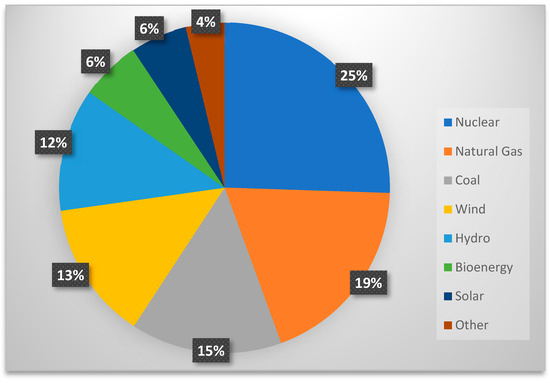 Figure 1 shows the major sources of electricity generation in the EU. According to the graph, it is clear that nuclear power became the primary source, which constitutes 25% of the total electricity generation in the EU. Natural gas is the second most-used resource to generate electricity in the EU, with 19%. It is also remarkable that renewables such as wind, solar, bioenergy, and hydro have a total share of 35%. A noteworthy point on the graph is that the sum of combustible fuels and natural gas still constitutes a significant share of the total electricity generation of the union. Furthermore, as mentioned for the specific countries before, energy sources are highly dependent on imports from non-EU countries [33].