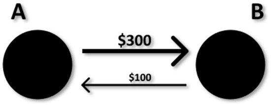 Figure 2 shows a simple example, which A and B are the actors of a network. It is clear that actor A and actor B are in a relationship. If the volume of the relation matters, as well as the existence thereof, the data should be weighted. Also, the relation weights are different for actors A and B. For instance, actor A imports 100 USD, while actor B imports 300 USD of goods. In such a case, the matrix should be asymmetrical.