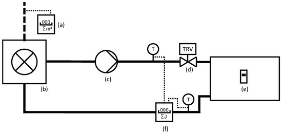 Simplified setup of the heating system and the measurement infrastructure. (a) Gas meter; (b) Boiler; (c) Pump; (d) Thermostat valve; (e) Heat cost allocator and (f) Heat flow meter. Dotted lines represent external sensors connected to the system.
