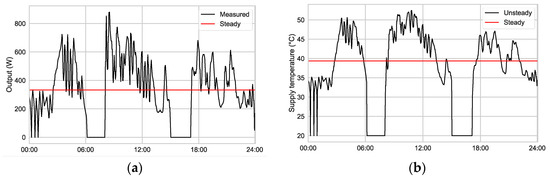 This section investigates whether maintaining a continuous heat supply, as opposed to providing it on demand, can lead to a reduction in the median supply temperature. Elevated heat power demands may stem from the initial operation or the behaviors of smart thermostats. In Germany, existing buildings typically possess a substantial thermal mass. Operating under the assumption that a constant room temperature can be maintained, there is limited necessity for recurrently reheating the building. To streamline the analysis, it is presumed that the heat power needed to sustain a consistent room temperature can be evenly distributed throughout the day. Figure 5a illustrates the estimated heat output of a radiator with a resolution of 110 s. In this example, the radiator’s standard output power is at , , and °C is W. The measured heat supply (black) fluctuates significantly throughout the day, ranging from 0 to approximately 850 Watts, with an average outside temperature of 13 °C. The average heat power is indicated by the red line at 332 Watts.