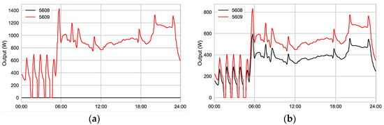 Figure 6a shows an example of the output power of two radiators in a single room over 24 h. Each measuring point corresponds to 110 s. The radiator 5608 (blue, W) does not emit any heat, while the radiator 5609 (red, W) emits up to 1400 watts. Figure 6b shows the possible output power distribution according to Equation (6).