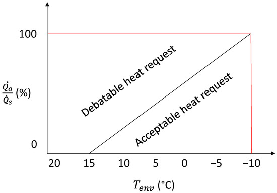 Nonetheless, it is important to recognize that properly sized radiators should be capable of maintaining a consistent room temperature at an environment temperature, typically between 15 °C and down to −10 °C (the standard environmental temperature). In simplified terms, heat losses increase linearly from the heating boundary (for standard cases) at 15 °C and 0% heat power, up to the standard environmental temperature at 100% heat capacity, as illustrated in Figure 8.