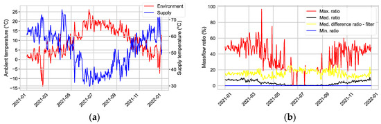 Daily outdoor temperatures at the site, depicted in red, span from −14 °C to approximately 25 °C. Figure 9a visually represents the average supply temperatures (blue), which fluctuate between 35 °C and 75 °C, and are not conducive for the use of an air-to-water heat pump. In Figure 9b, we present aggregations of the mass flow ratio within this property. The mass flow ratio reflects the proportion of actual mass flow in a radiator relative to its corresponding design mass flow. The median daily mass flow ratio (black) reaches a maximum of about 11%. When filtering out inactive radiators, the median mass flow ratio varies between 7% and 30%. The maximum daily mass flow ratio (red) typically falls within a range below 60%, highlighting the most demanding radiator of each day. It is worth noting that there are permanently inactive radiators, resulting in a minimum daily mass flow ratio (blue) of 0%.