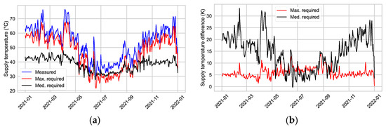 Figure 10a depicts the limiting supply temperature (max. required; red) and the measured supply temperature (blue). The limit supply temperature, representing the highest necessary flow temperature dictated by the most heavily utilized radiator, already offers the potential for reducing the supply temperature compared to the measured supply temperature. The median of the required supply temperature (excluding the inactive radiators; black) falls within the range of 30 to 40 °C, indicating further potential for reduction. The additional potential is presented in Figure 10b as the difference between the measured supply temperature and both the limiting and the median necessary supply temperatures (red; black).