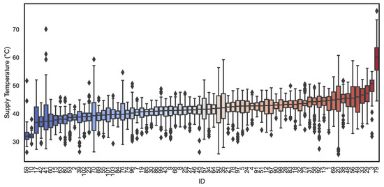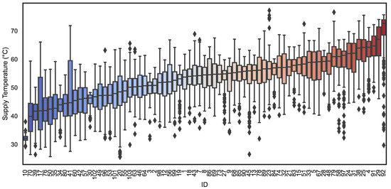 Leveraging data derived from 73 buildings with substantial measurement data availability for the heating season of 2021–2022, we computed the median daily required supply temperature for all radiators and presented this data graphically in Figure 11 as a boxplot. Each building is denoted by a unique identifier, and these identifiers are arranged in ascending order according to the median required flow temperature, from the lower end (depicted in blue) to the higher end (depicted in red). When disregarding outliers, the supply temperature predominantly falls within the range of 40 °C to 50 °C. However, certain days, exemplified by Building ID 41, exhibit significant deviations of daily outliers from the median necessary supply temperature. Potential causes of such deviations may include a low count of inactive radiators experiencing high utilization on warm days or issues with the boilers. Consequently, further investigation is warranted to explore these anomalies comprehensively.